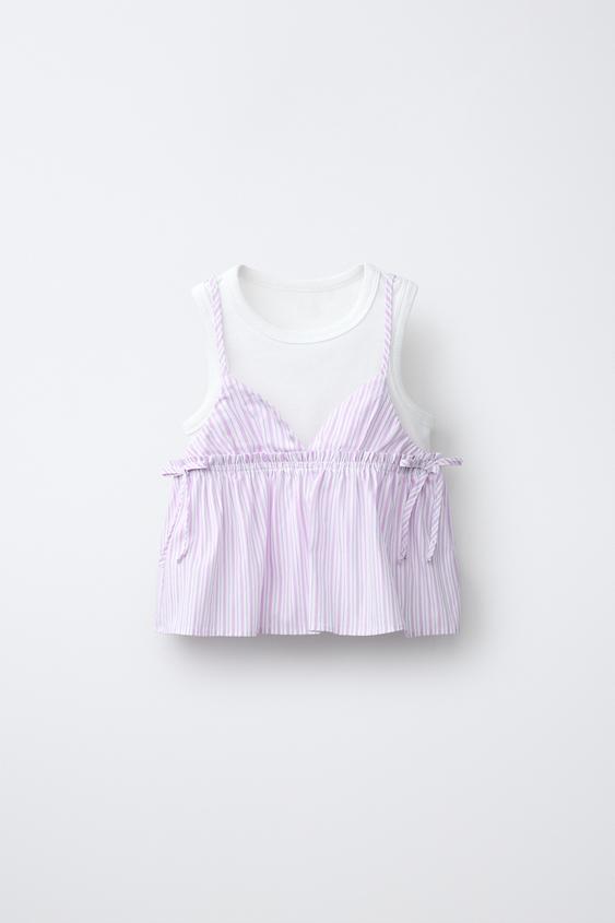 Топ в полоску с V-образным вырезом и бретельками. Банты по бокам. Внутренняя футболка в рубчик с круглым вырезом и короткими рукавами.