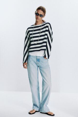 ZARA ТОП В ПОЛОСКУ С РУКАВАМИ «ЛЕТУЧАЯ МЫШЬ», ТЕМНО-СИНИЙ/БЕЛЫЙ