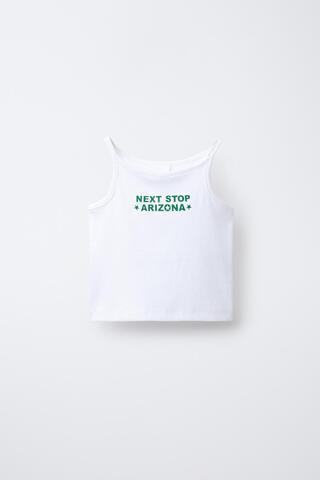 Топ в рубчик с круглым вырезом и бретелями. Текст с принтом спереди. Ткань: 97 % хлопок.