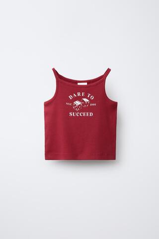 Топ в рубчик с круглым вырезом и бретелями. Текст с принтом спереди. Ткань: 97 % хлопок.