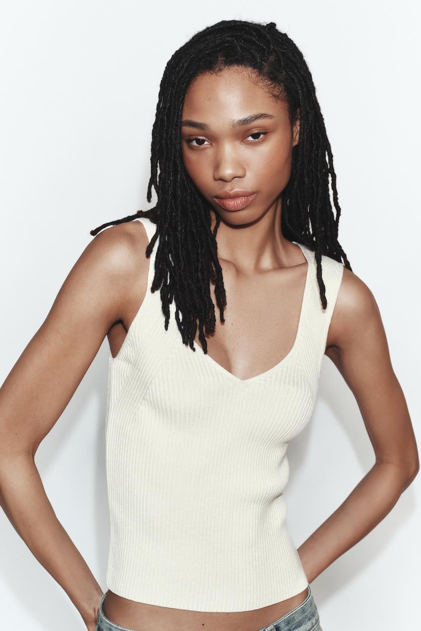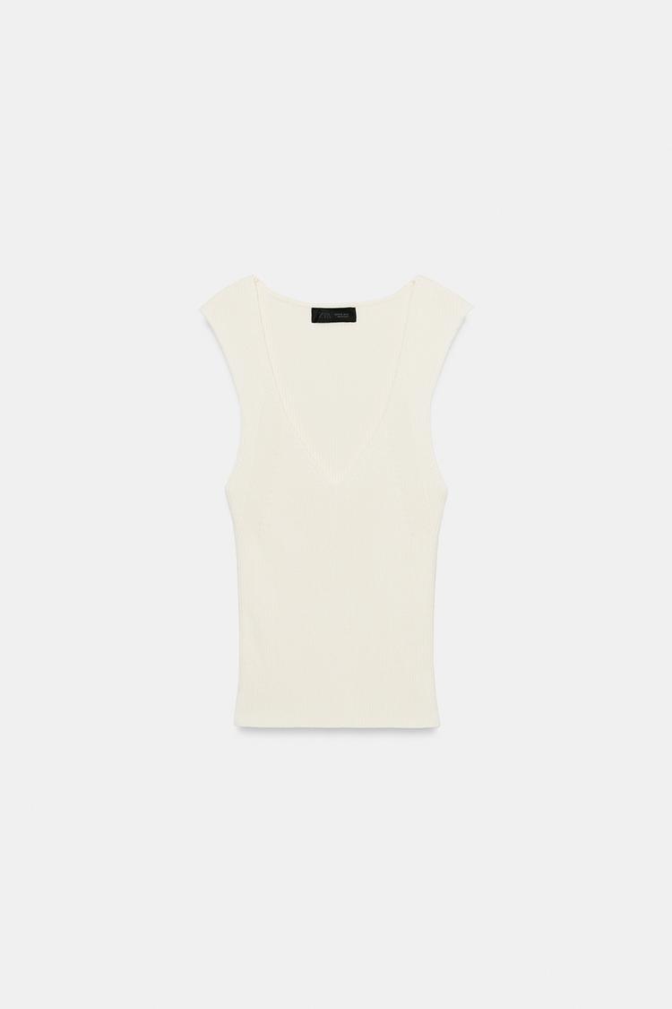Топ в рубчик с V-образным вырезом и без рукавов.