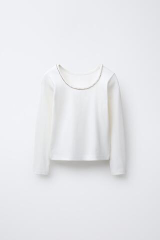 Футболка с круглым вырезом и длинными рукавами. Отделка стразами на горловине и спине. Ткань: 96 % хлопок.