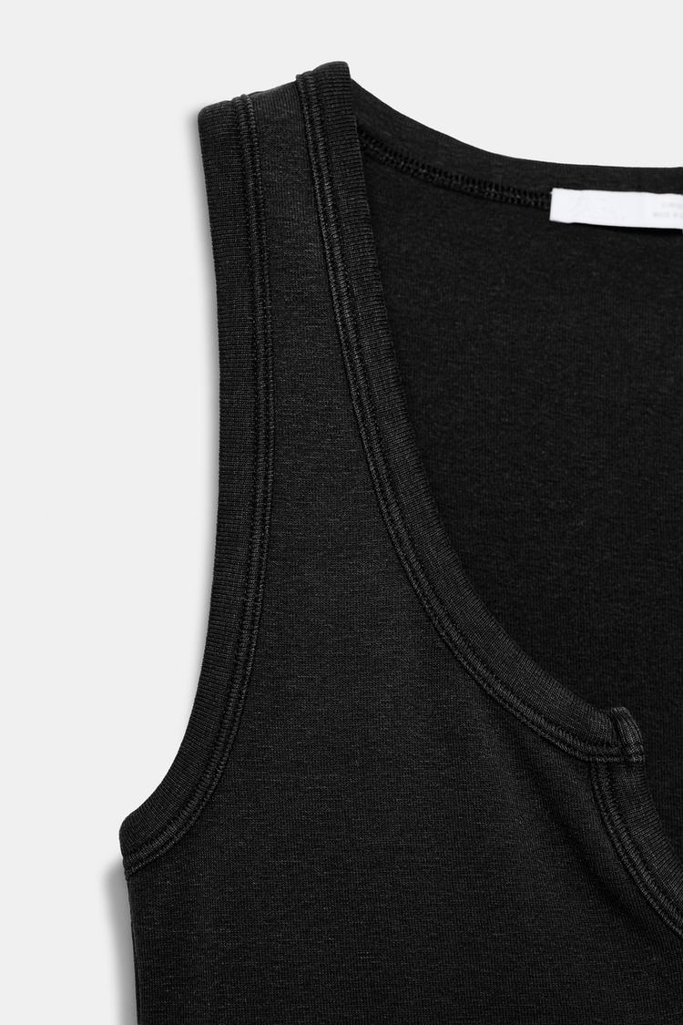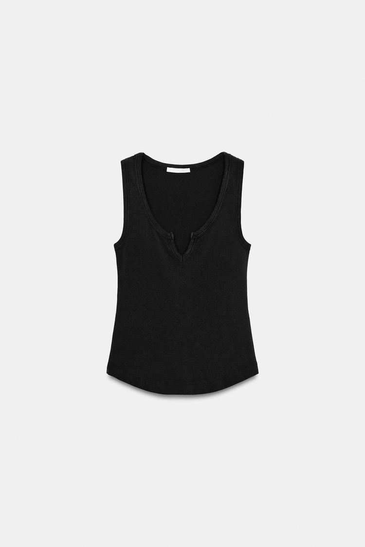 Топ из смесового хлопка с эффектом потертости. Круглый вырез с деталью в виде разреза. Рукава без рукавов.