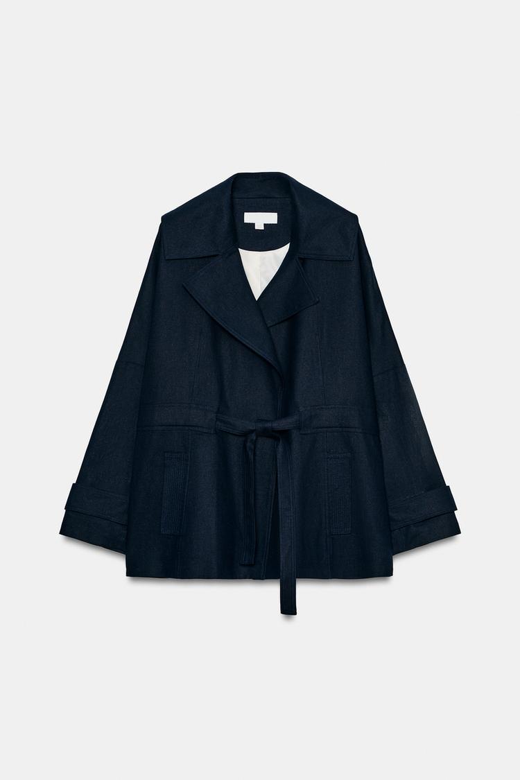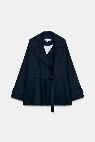 ZARA ТРЕНЧ ИЗ ЛЬНА С РЕМНЕМ, МОРСКОЙ СИНИЙ