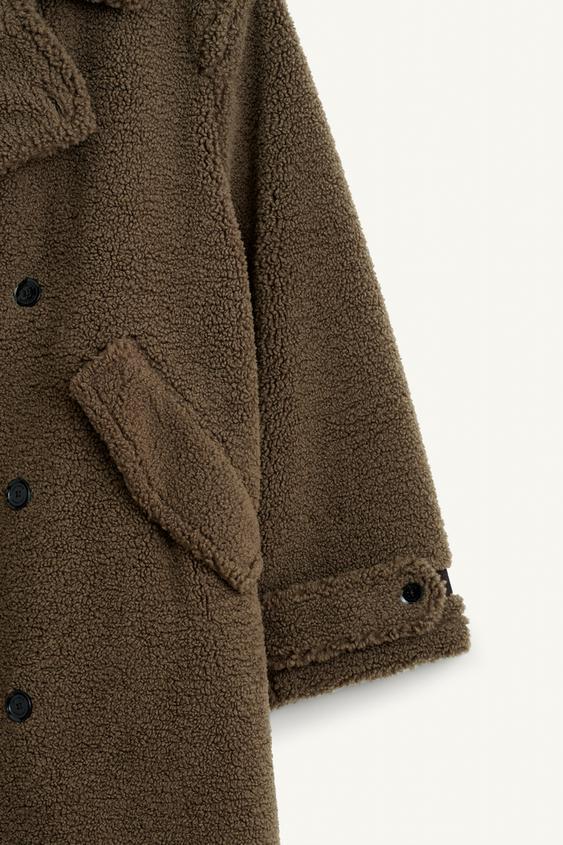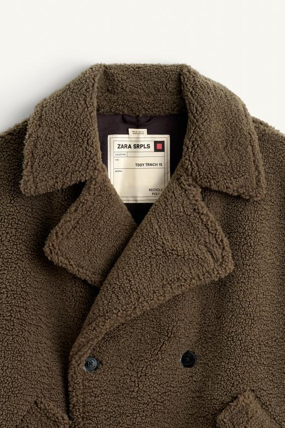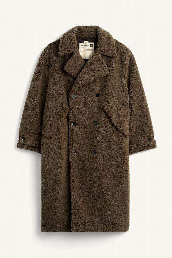 Тренч свободного кроя из искусственной замши с искусственным мехом. Воротник с лацканами и длинными рукавами с регулируемыми манжетами. На бедрах карманы с клапанами, а на подоле — центральная задняя шлица. Двубортная застежка на пуговицы спереди.