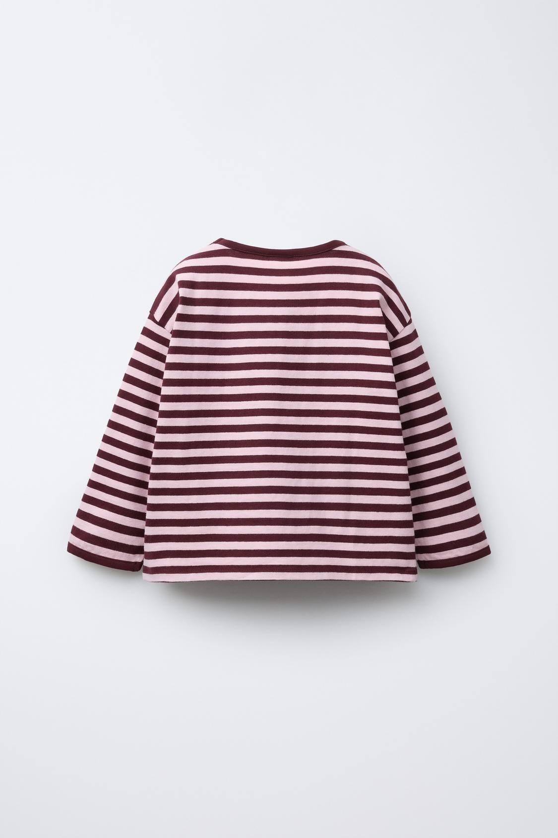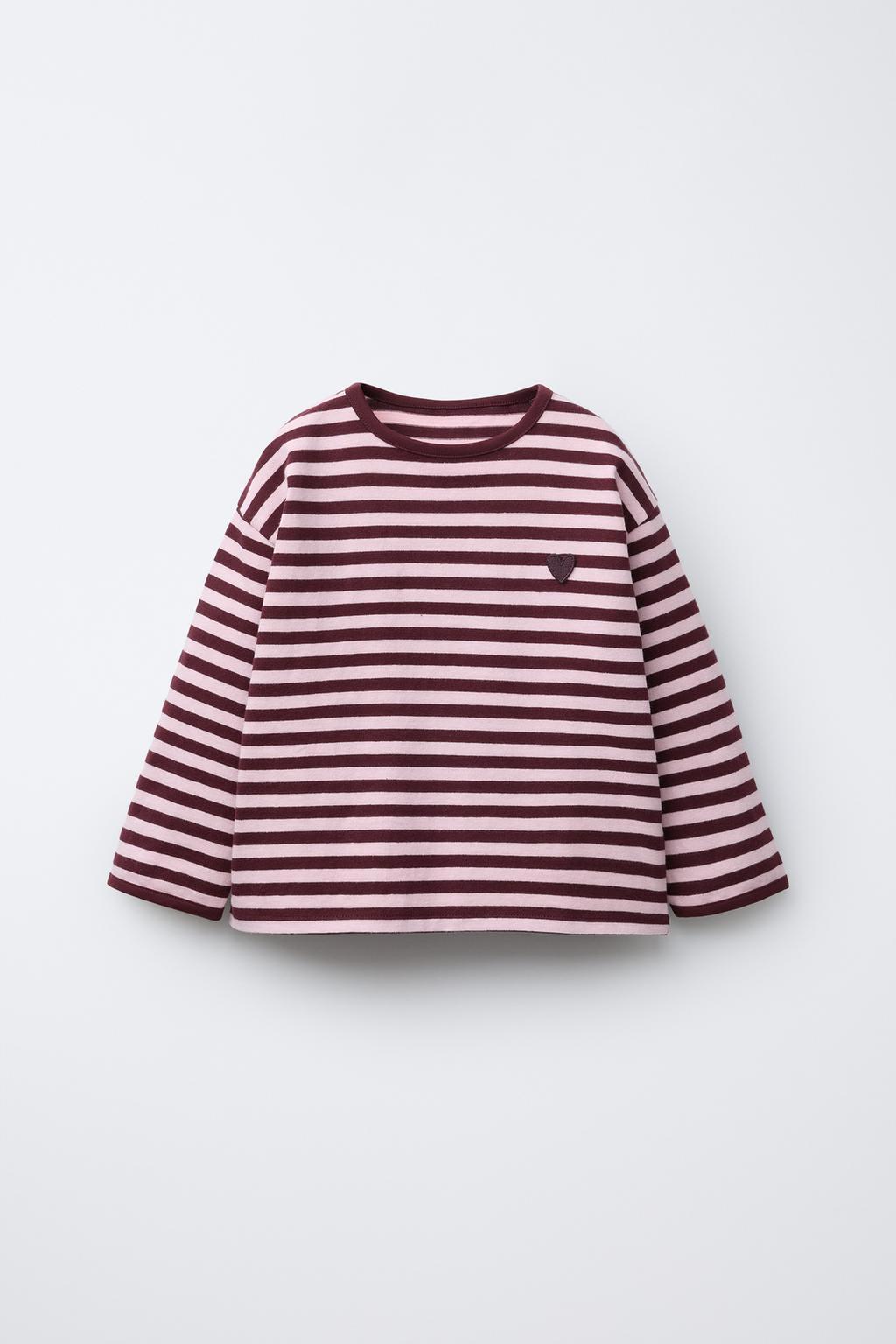 ZARA ТРИКОТАЖНАЯ ФУТБОЛКА В ПОЛОСКУ С НАШИВКОЙ «СЕРДЦЕ», ГРАНАТОВЫЙ