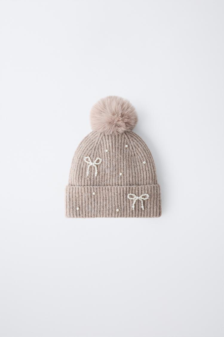 ZARA ТРИКОТАЖНАЯ ШАПКА С БЛЕСКОМ И ПОМПОНОМ, КОРИЧНЕВЫЙ МЕЛАНЖ