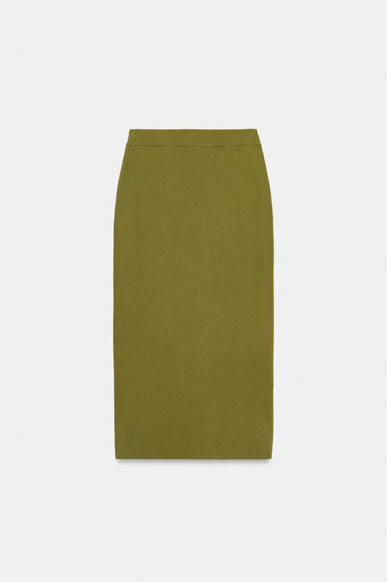 ZARA ТРИКОТАЖНАЯ ЮБКА МИДИ, ЦВЕТ МХА