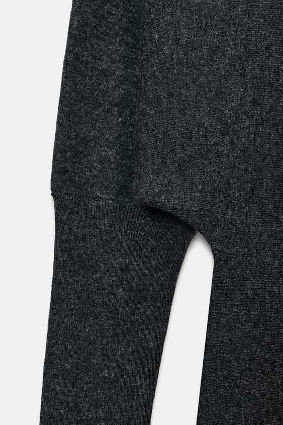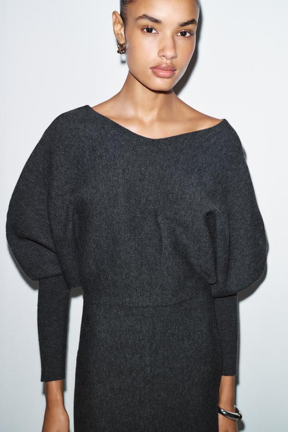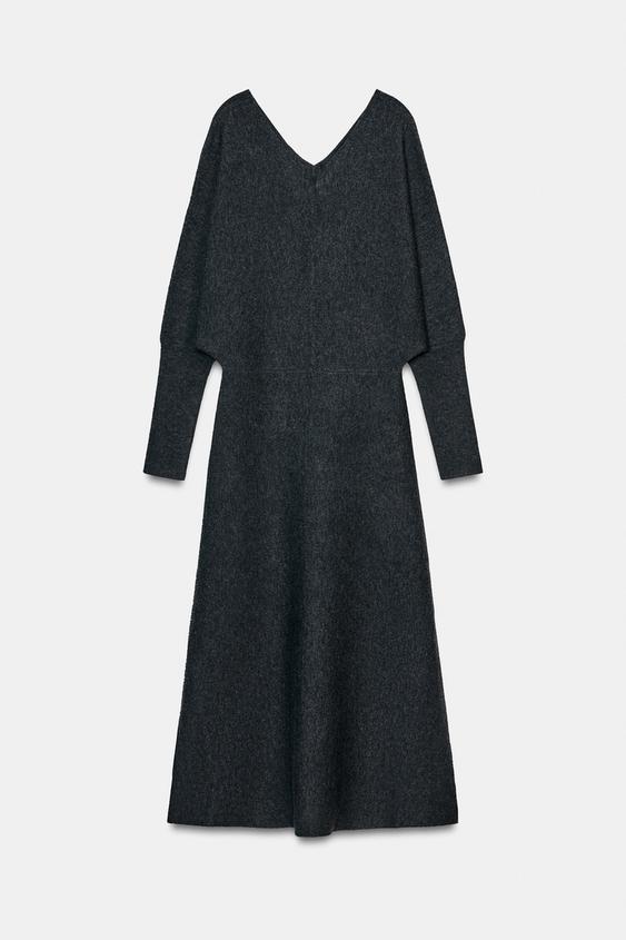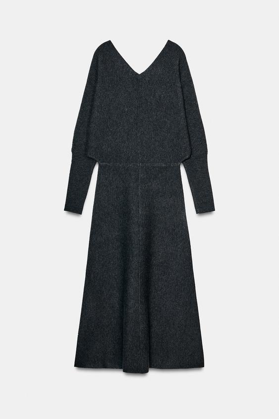 ZARA ТРИКОТАЖНОЕ ПЛАТЬЕ МИДИ С V-ОБРАЗНЫМ ВЫРЕЗОМ, СЕРЫЙ