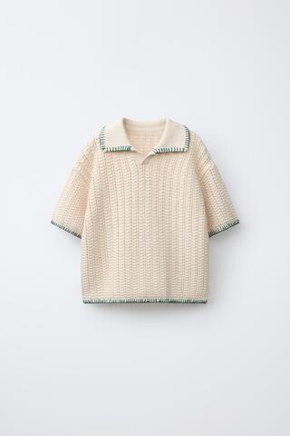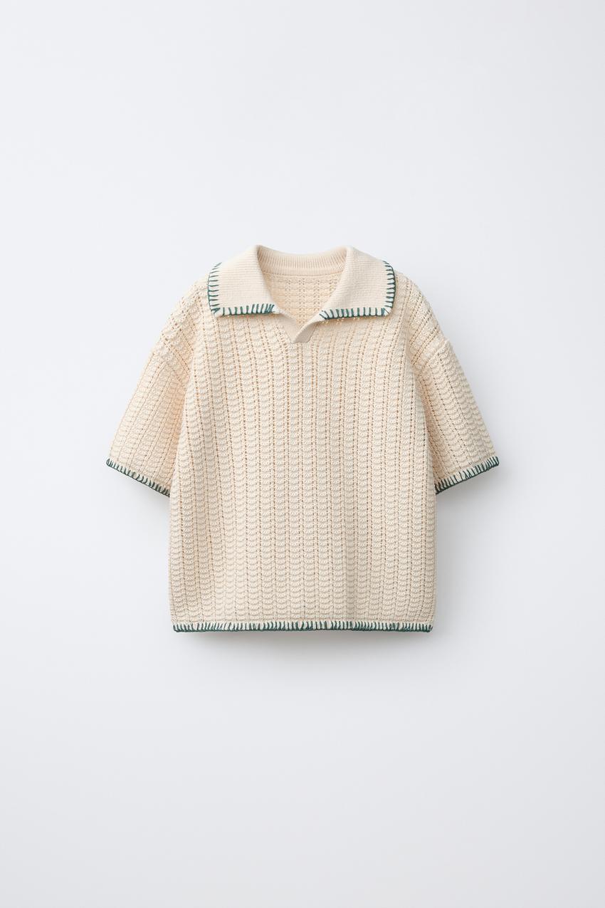 ZARA ТРИКОТАЖНОЕ ПОЛО С ДЕКОРАТИВНОЙ СТРОЧКОЙ, ЭКРЮ/ЗЕЛЕНЫЙ