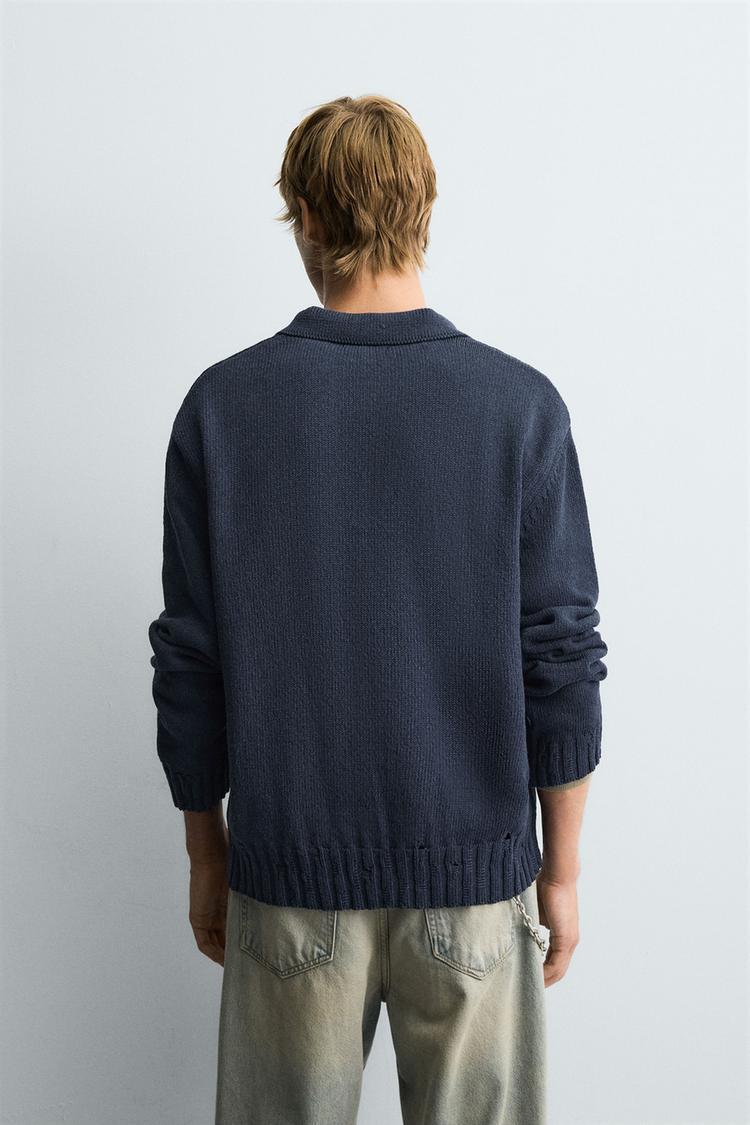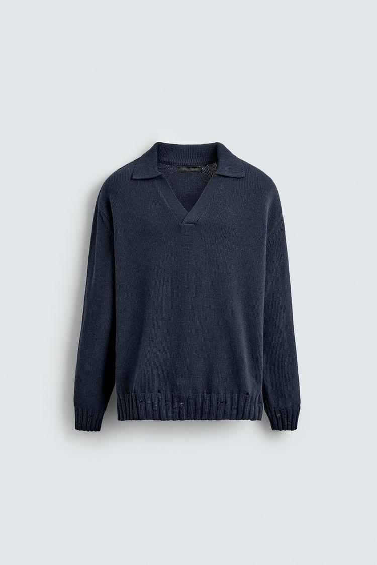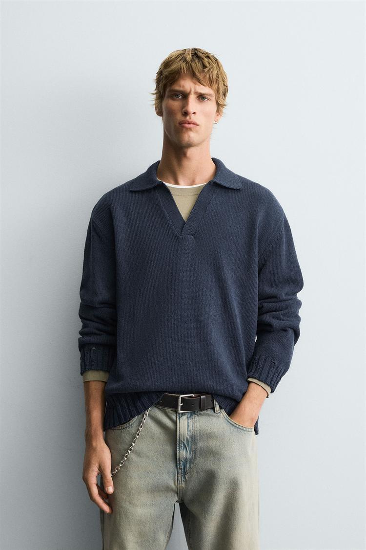 ZARA ТРИКОТАЖНОЕ ПОЛО С ПЕТЕЛЬНЫМ УЗОРОМ, ИНДИГО
