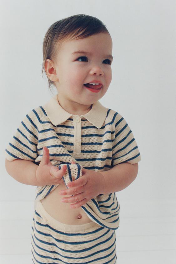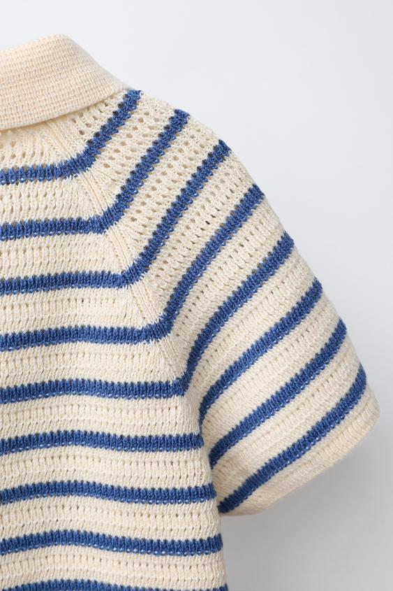 ZARA ТРИКОТАЖНОЕ ПОЛО В ПОЛОСКУ, ЭКРЮ/СИНИЙ