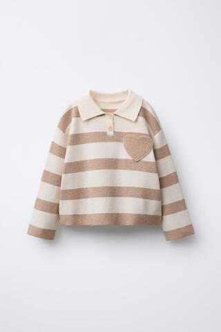 ZARA ТРИКОТАЖНОЕ ПОЛО В ПОЛОСКУ С КАРМАНОМ-СЕРДЦЕМ, ЭКРЮ/БЕЖЕВЫЙ