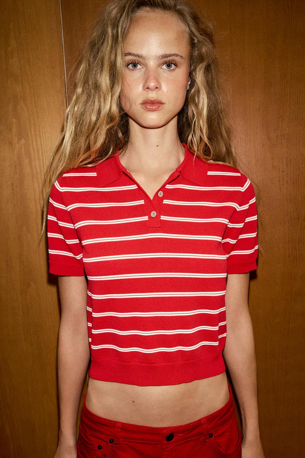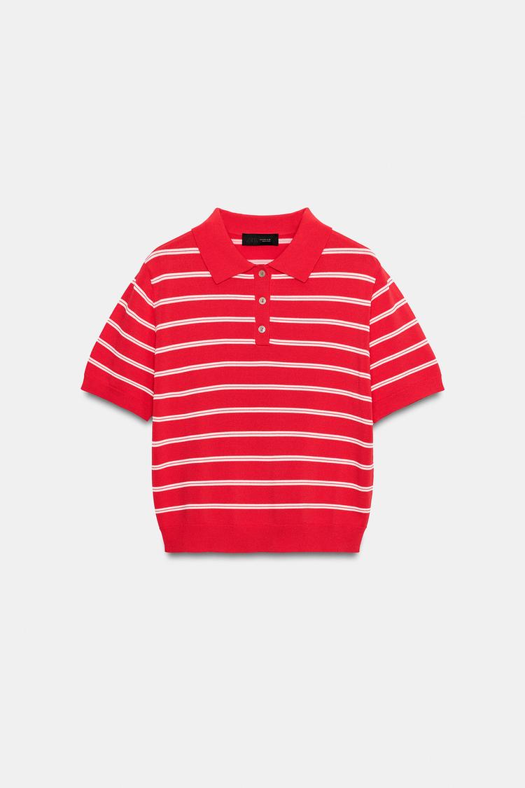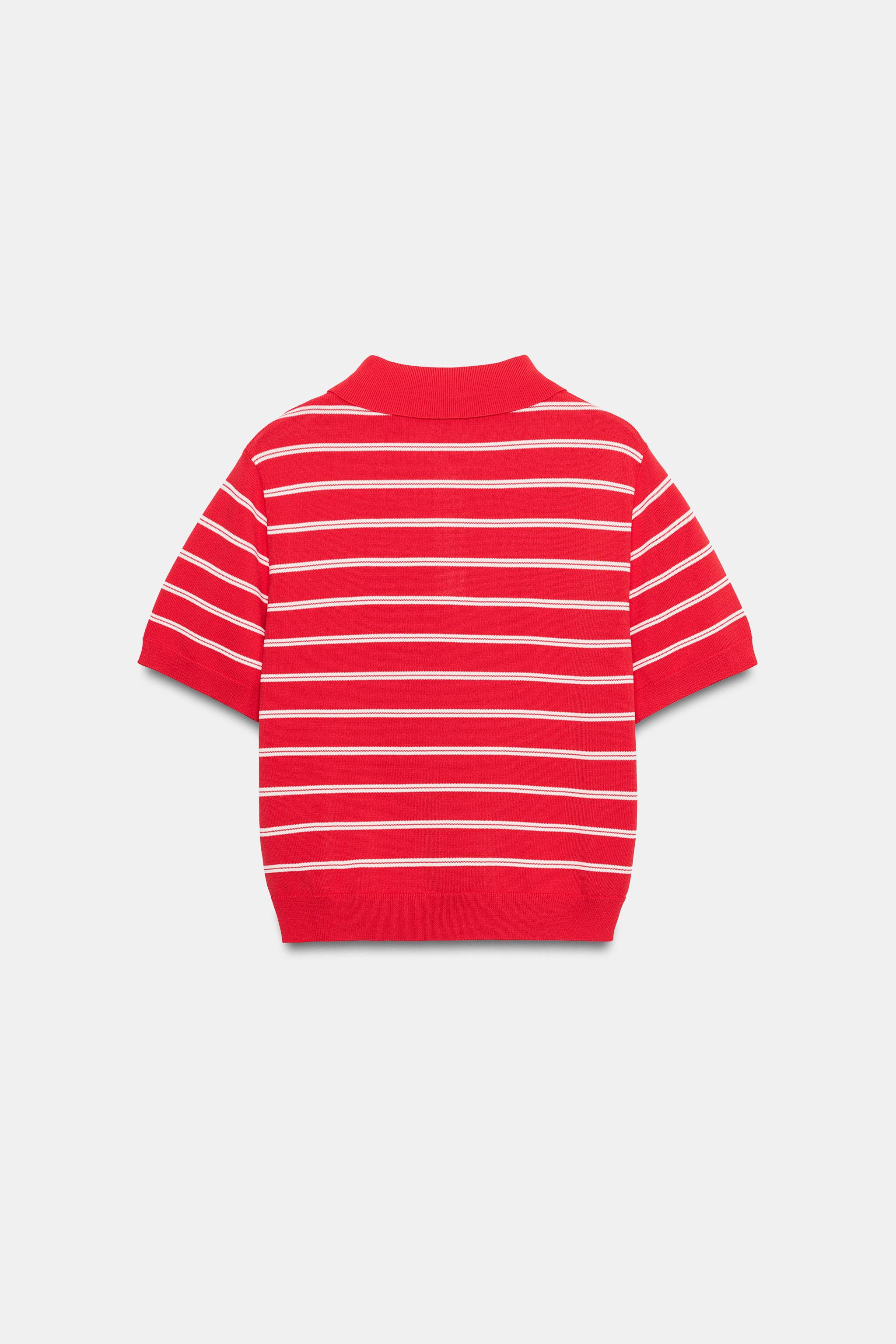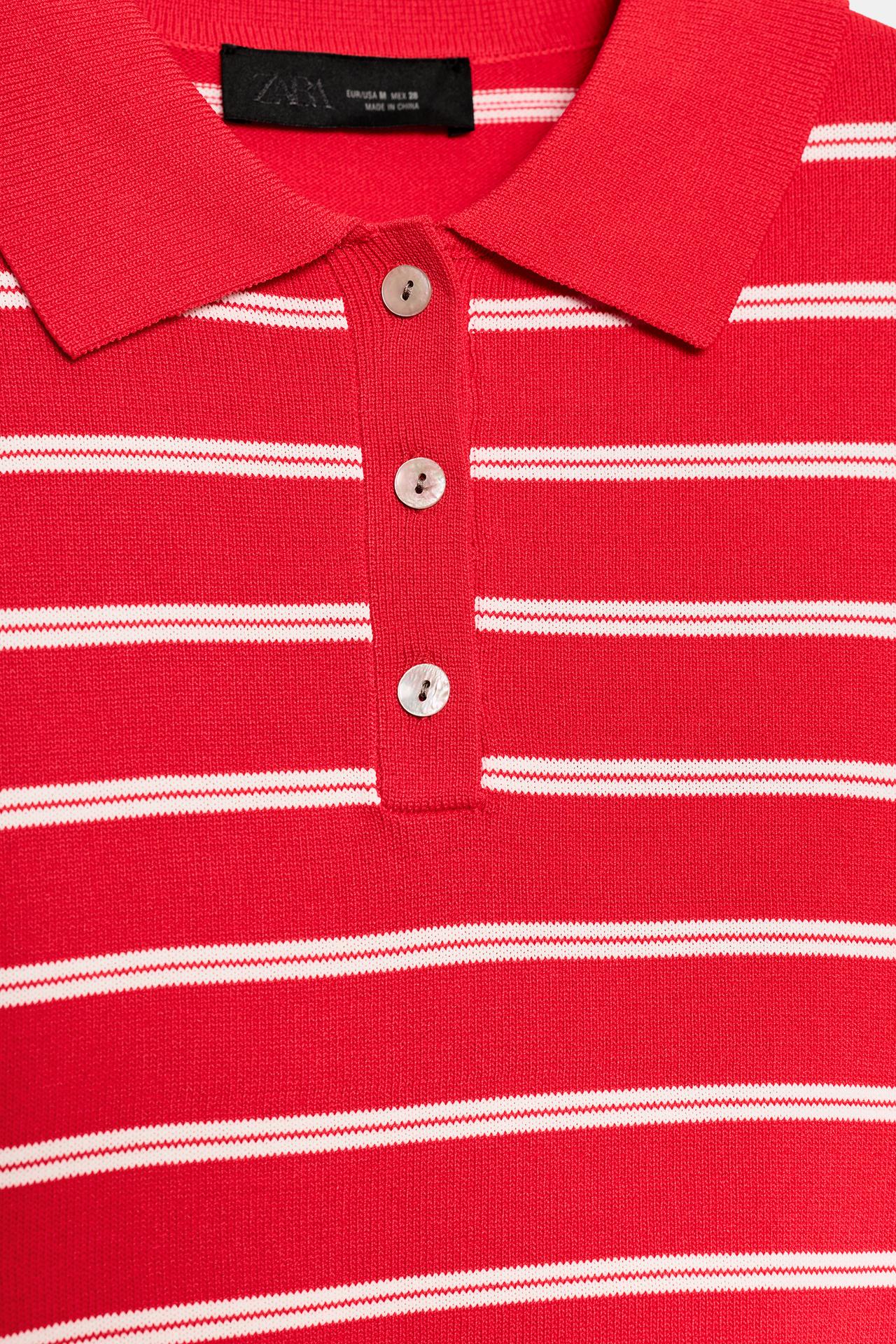 ZARA ТРИКОТАЖНОЕ ПОЛО В ПОЛОСКУ С КОРОТКИМ РУКАВОМ, КРАСНЫЙ