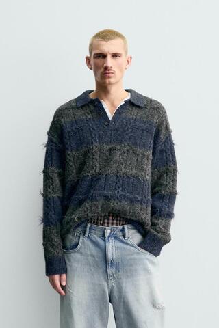 Трикотажное поло свободного кроя из пряжи с текстурой. Отложной воротник с застежкой на пуговицах спереди. Длинные рукава. Отделка в рубчик.