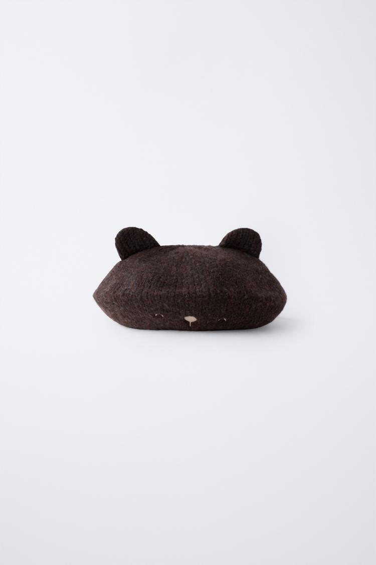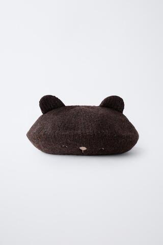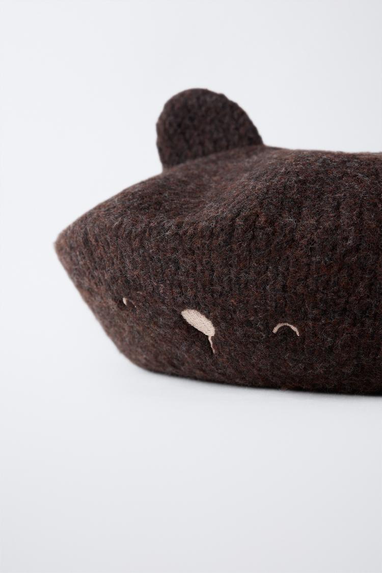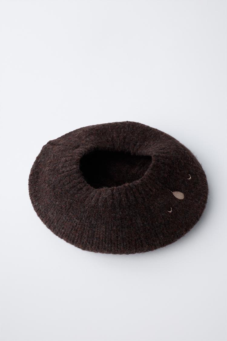 ZARA ТРИКОТАЖНЫЙ БЕРЕТ С ВЫШИВКОЙ И УШАМИ, КОРИЧНЕВЫЙ