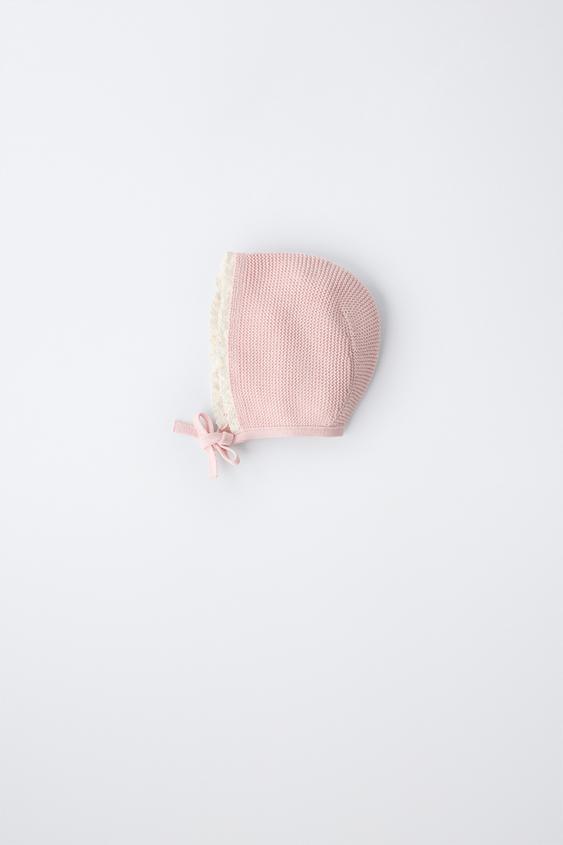 ZARA ТРИКОТАЖНЫЙ ЧЕПЧИК С КОНТРАСТНЫМ КРУЖЕВОМ, ПАСТЕЛЬНО-РОЗОВЫЙ