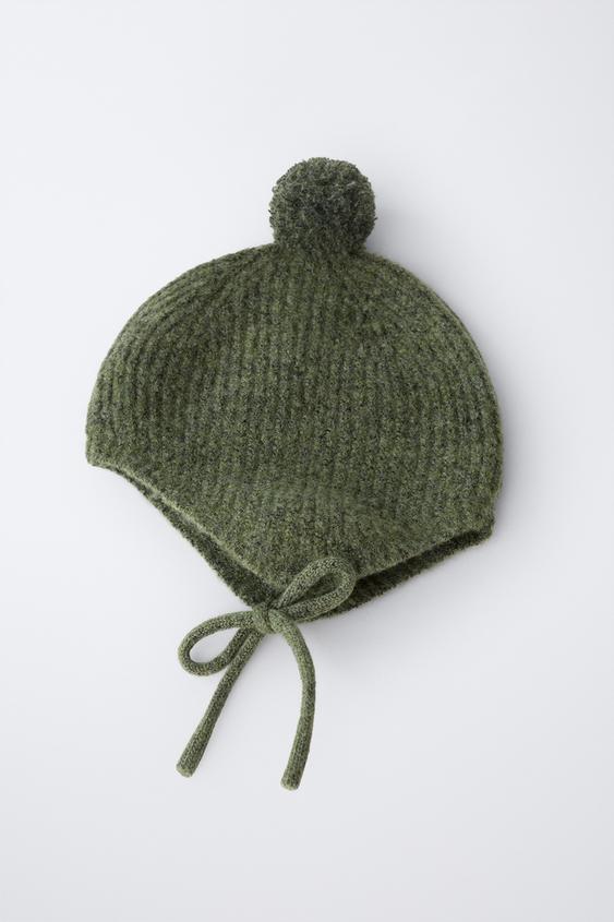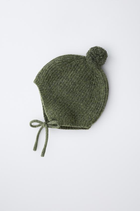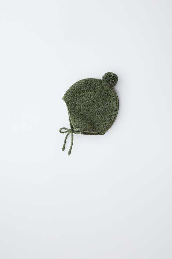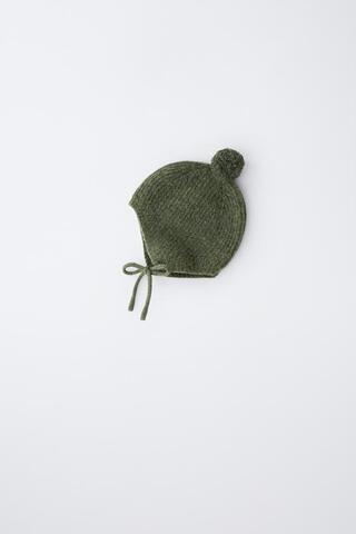 ZARA ТРИКОТАЖНЫЙ ЧЕПЧИК С ПОМПОНОМ, МЯГКИЙ ЗЕЛЕНЫЙ