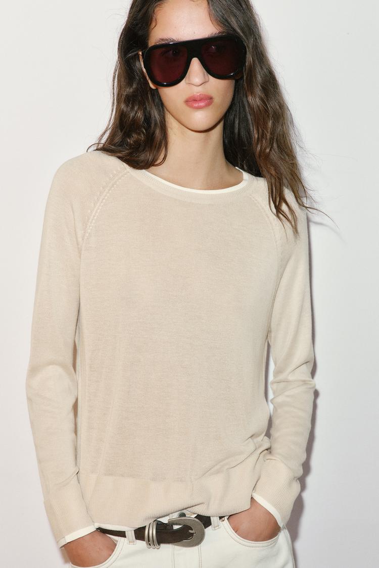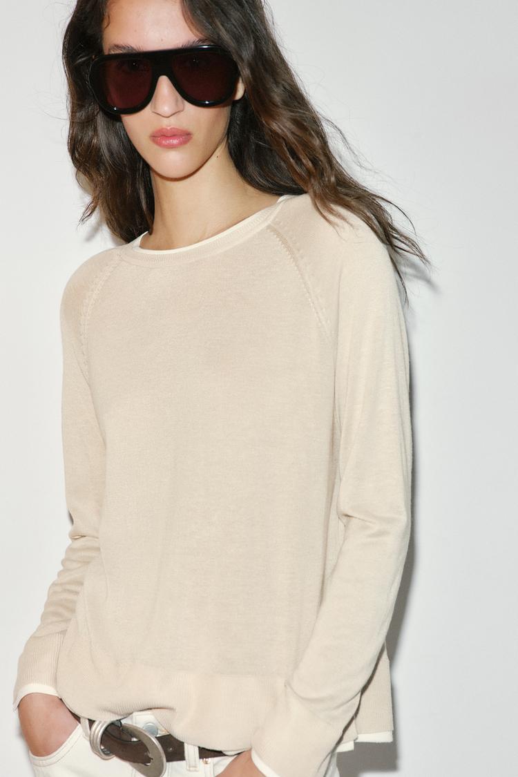 Свитер с двойным эффектом, изготовленный из трикотажной ткани. Имеет круглый вырез и длинные рукава.