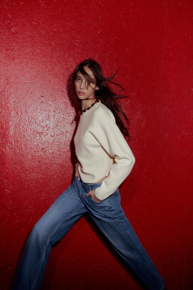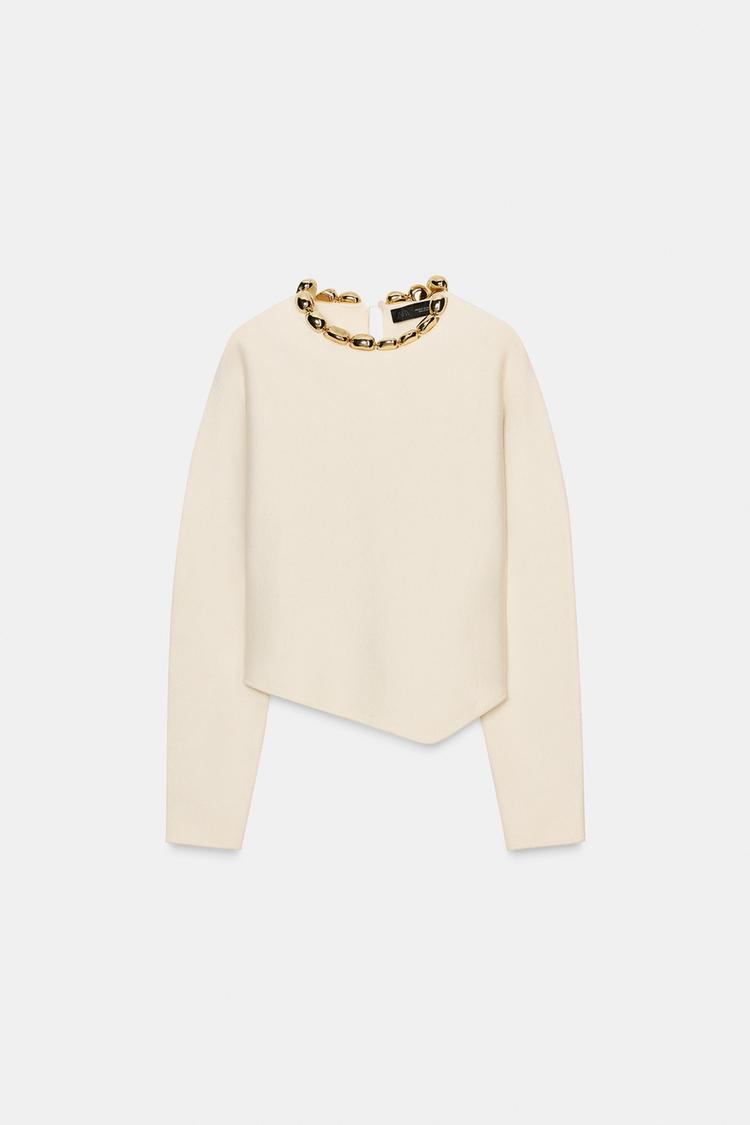 ZARA ТРИКОТАЖНЫЙ ДЖЕМПЕР С БУСИНАМИ НА ВОРОТНИКЕ, ЭКРЮ