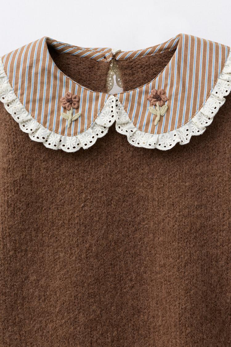 ZARA ТРИКОТАЖНЫЙ ДЖЕМПЕР С ПОЛОСАТЫМ ВОРОТНИКОМ И ЦВЕТАМИ, ШОКОЛАДНЫЙ