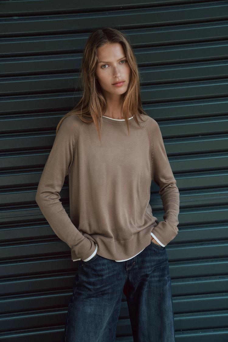 Свитер с двойным эффектом, изготовленный из трикотажной ткани. Имеет круглый вырез и длинные рукава.