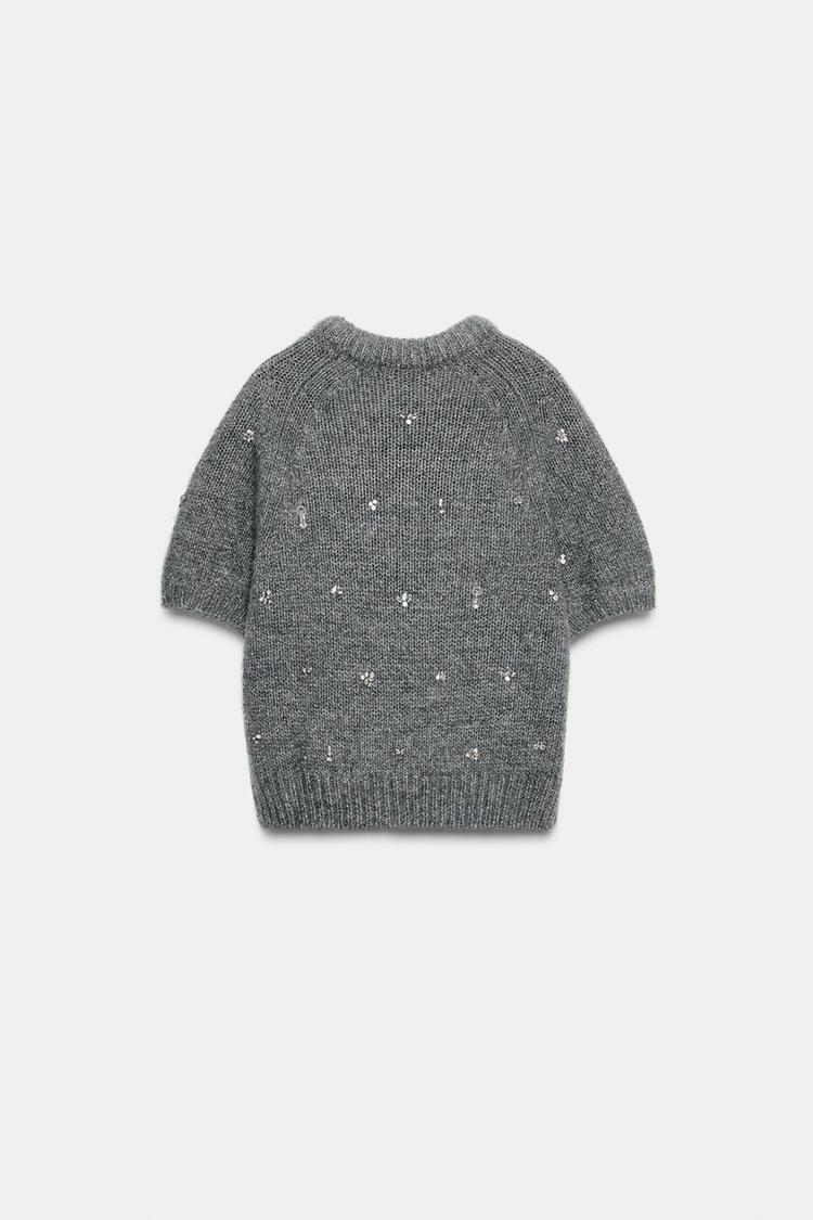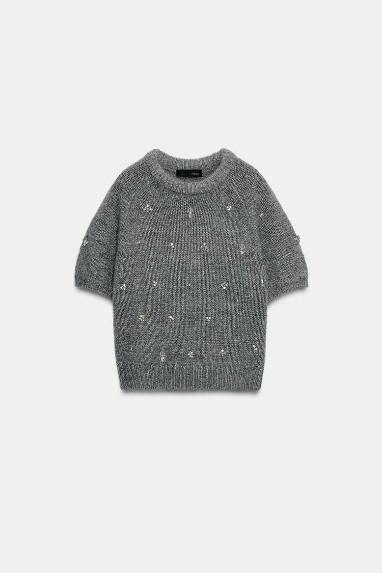 ZARA ТРИКОТАЖНЫЙ ДЖЕМПЕР СО СТРАЗАМИ, СЕРЫЙ