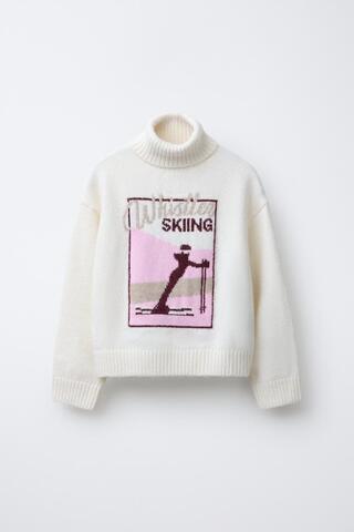 Трикотажный свитер с высоким воротником и длинными рукавами. С принтом лыжника спереди.