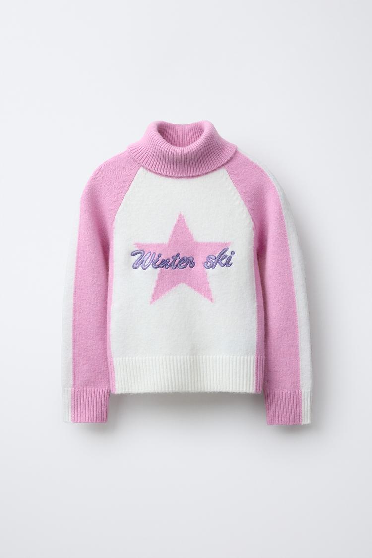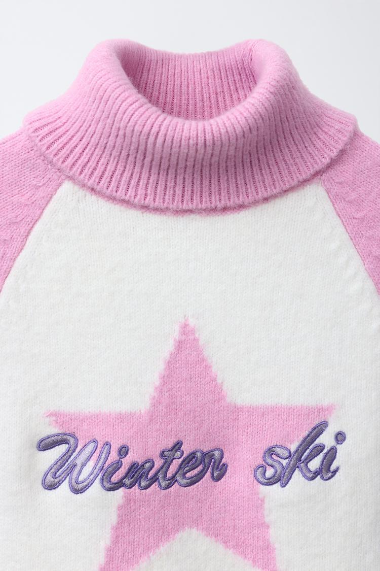 Трикотажный свитер с высоким воротником, длинными рукавами, вставками спереди в виде звезды и вышивкой с надписью.