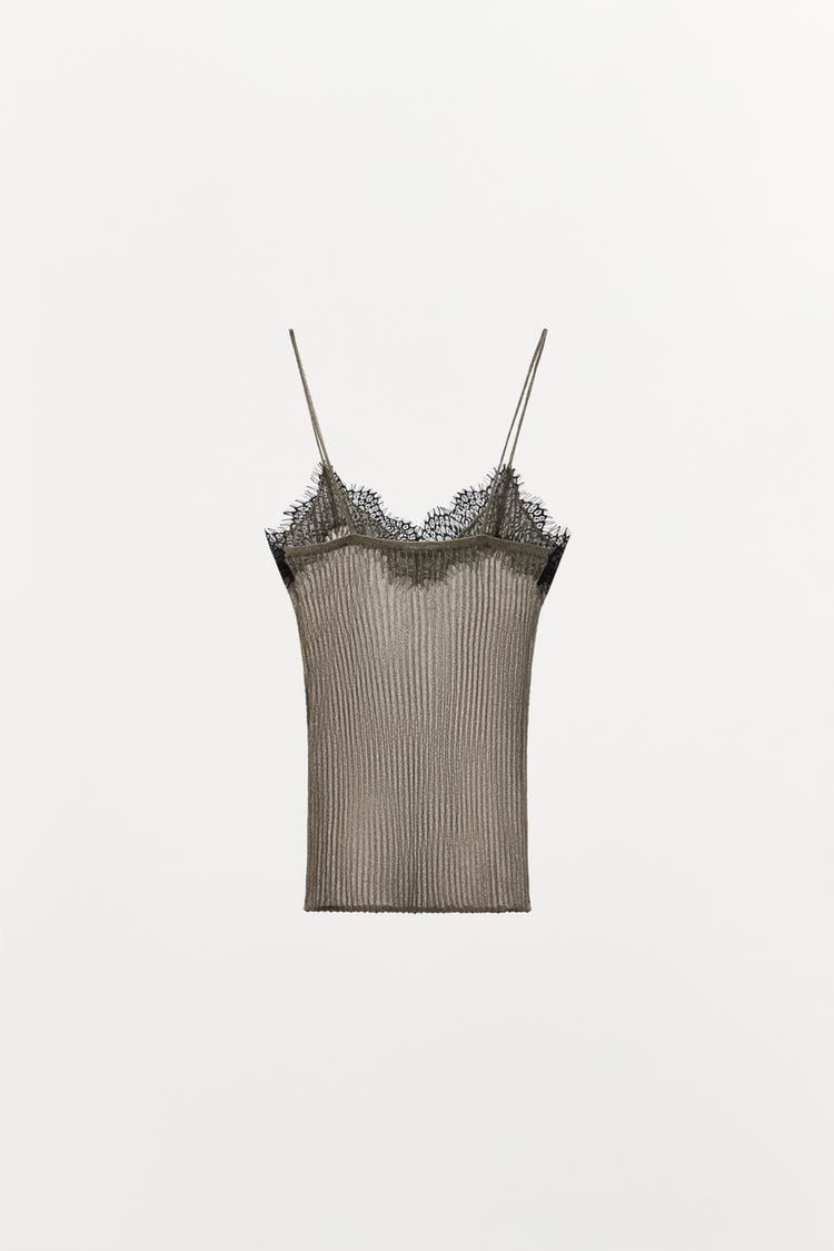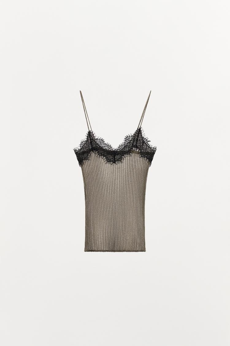 ZARA ТРИКОТАЖНЫЙ ТОП С БЛЕСТЯЩЕЙ НИТЬЮ И КРУЖЕВОМ, ЗОЛОТИСТЫЙ