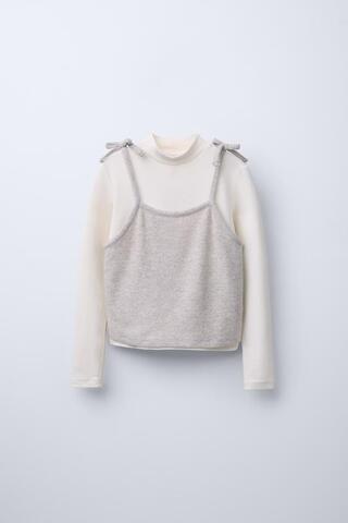 ZARA ТРИКОТАЖНЫЙ ТОП С КОНТРАСТНЫМИ РУКАВАМИ, БЕЖЕВЫЙ