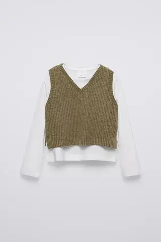 ZARA ТРИКОТАЖНЫЙ ТОП С КОНТРАСТНЫМИ РУКАВАМИ, ЗЕЛЕНЫЙ С МЕЛАНЖЕВЫМ ЭФФЕКТОМ