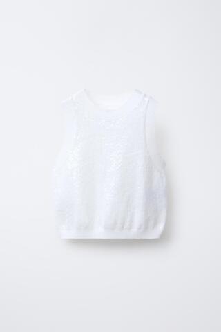 Трикотажный топ с круглым вырезом и без рукавов. Отделка пайетками спереди.