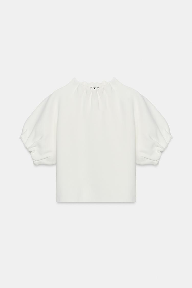ZARA ТРИКОТАЖНЫЙ ТОП С РЮШАМИ, БЕЛЫЙ