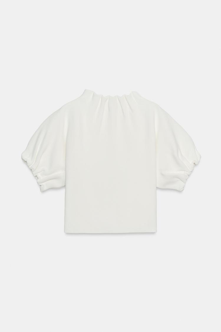 Топ с круглым вырезом и короткими рукавами-фонариками. Эластичные края с рюшами.