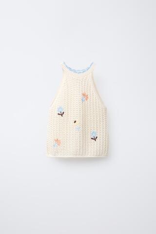 Топ крупной вязки без рукавов. Горловина халтер, вышивка «Цветы». Изготовлен из 100% хлопка.