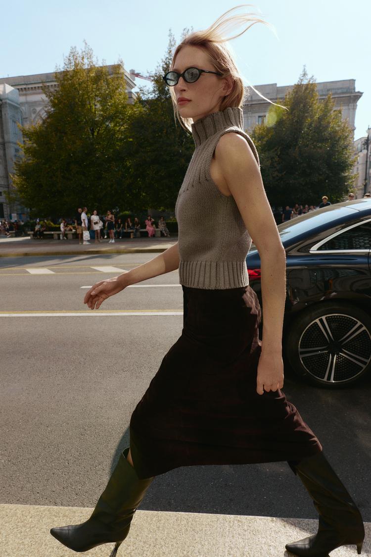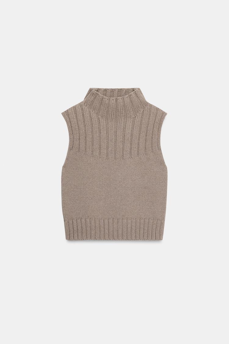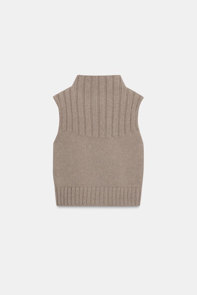 ZARA ТРИКОТАЖНЫЙ ТОП С ВОРОТНИКОМ-СТОЙКОЙ, СЕРОВАТО-КОРИЧНЕВЫЙ