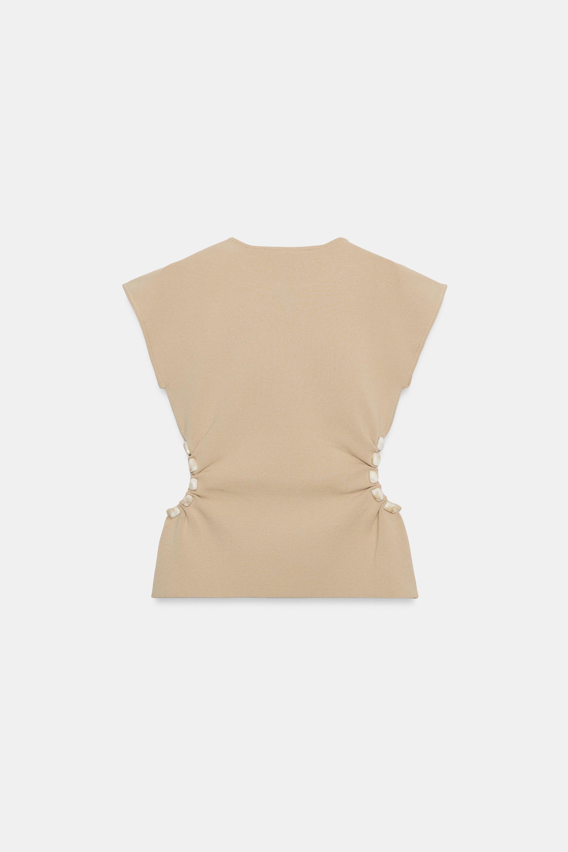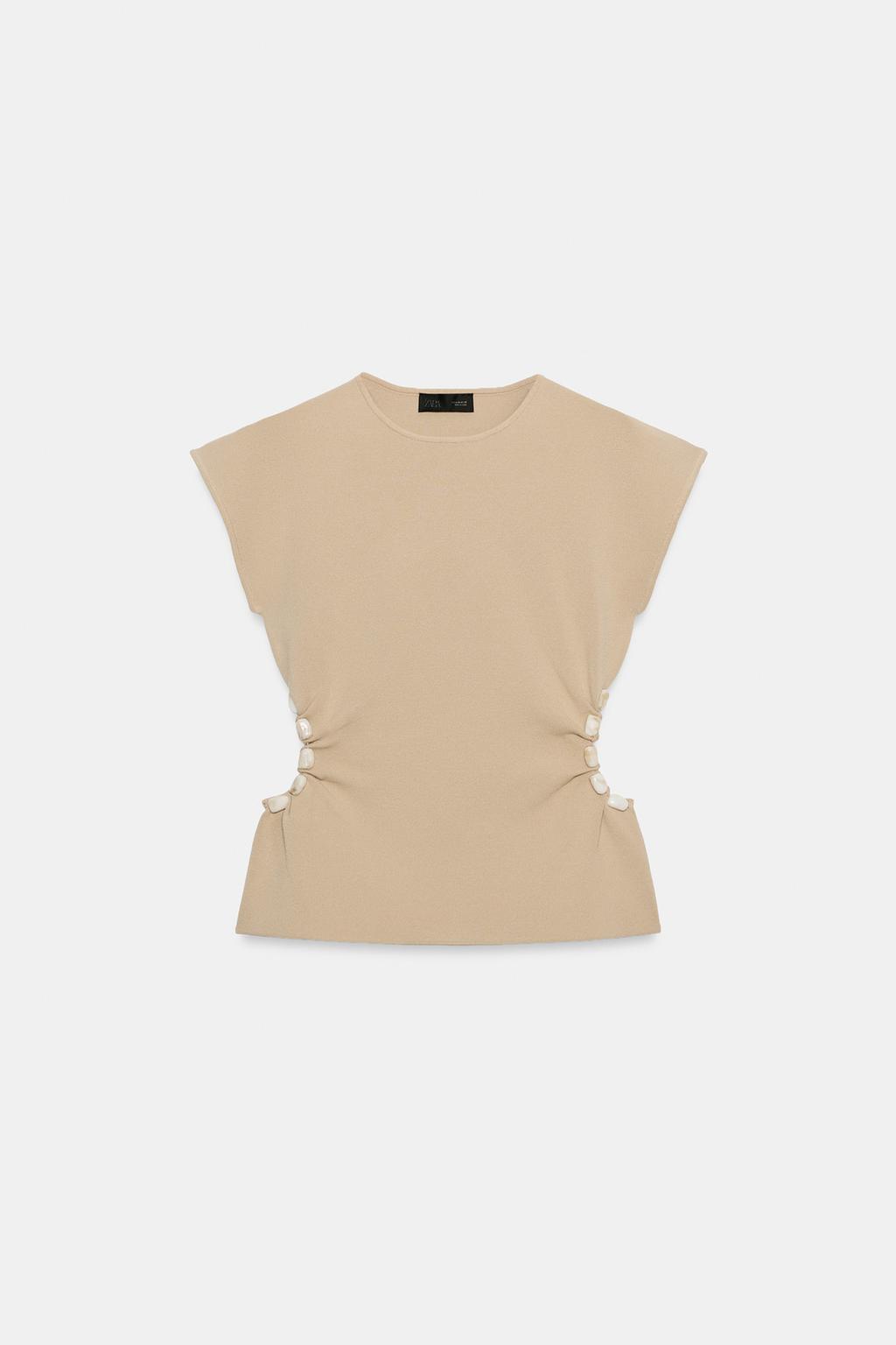ZARA ТРИКОТАЖНЫЙ ТОП С ВЫРЕЗАМИ И БУСИНАМИ, ПУДРОВЫЙ