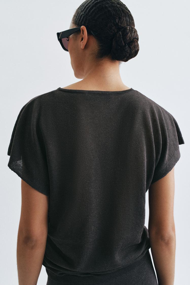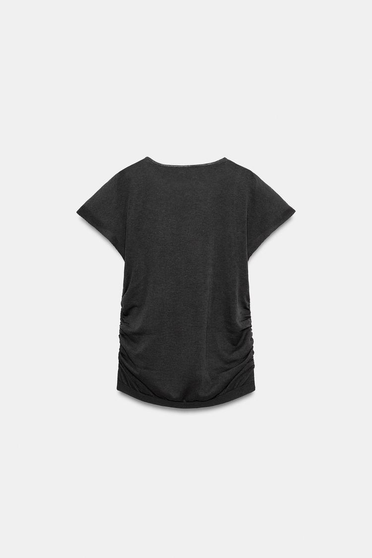 Трикотажный топ с круглым вырезом и короткими рукавами. Боковые сборки.