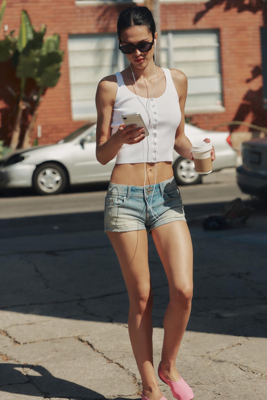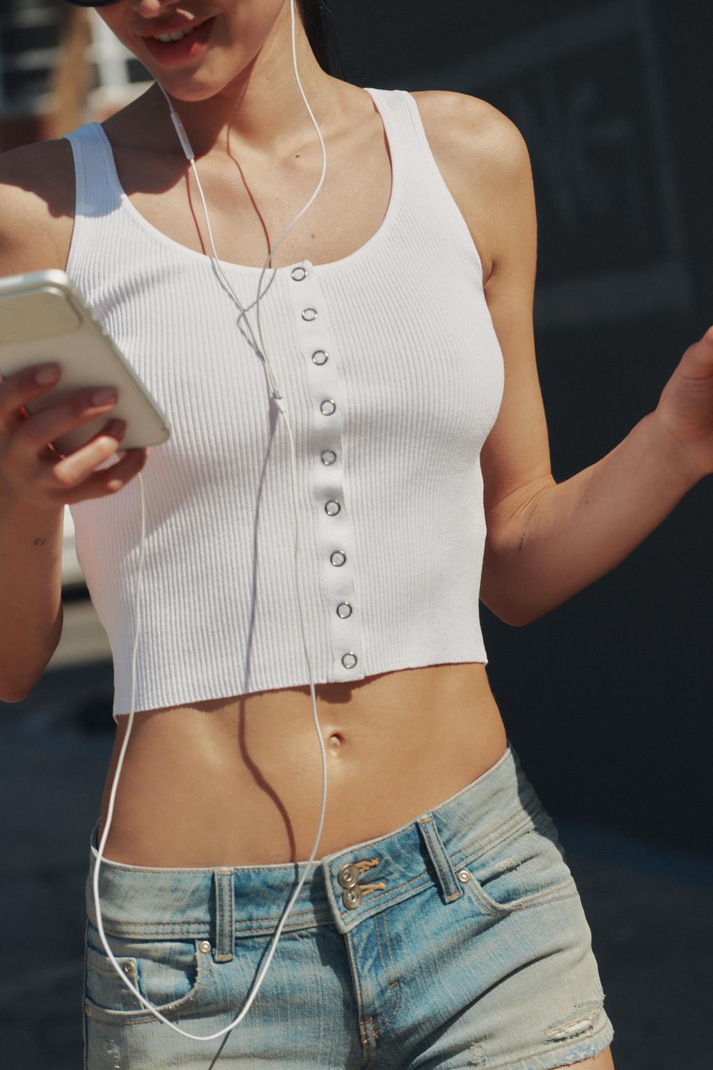 Топ без рукавов с круглым вырезом. Застежка на кнопки спереди.