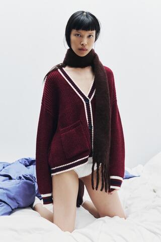 Куртка с V-образным вырезом и длинными рукавами. Накладные карманы и застежка на пуговицы спереди.