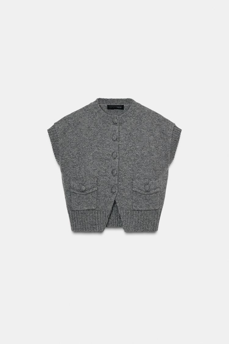 ZARA ТРИКОТАЖНЫЙ ЖИЛЕТ С ОБТЯЖНЫМИ ПУГОВИЦАМИ, СЕРЫЙ