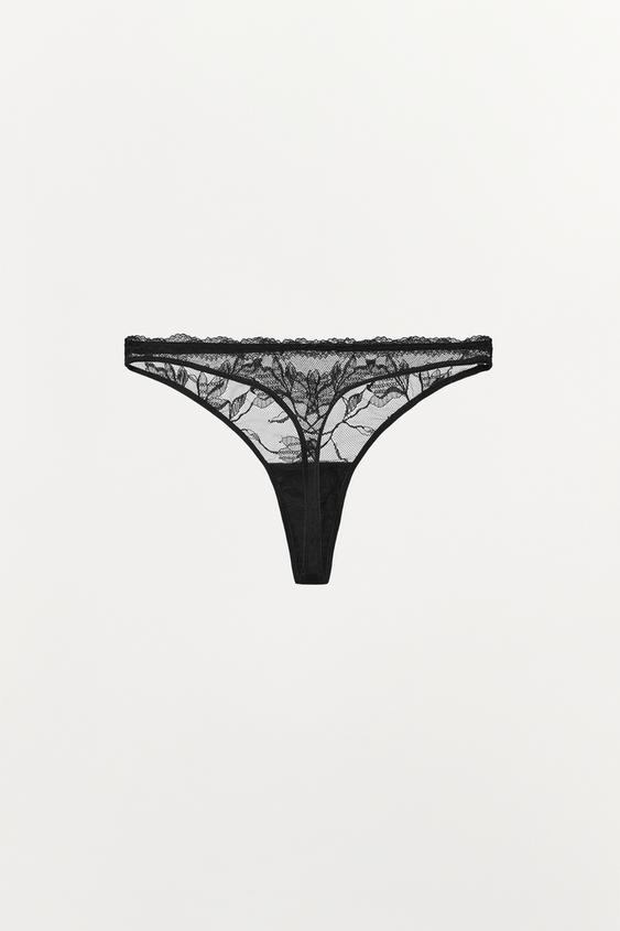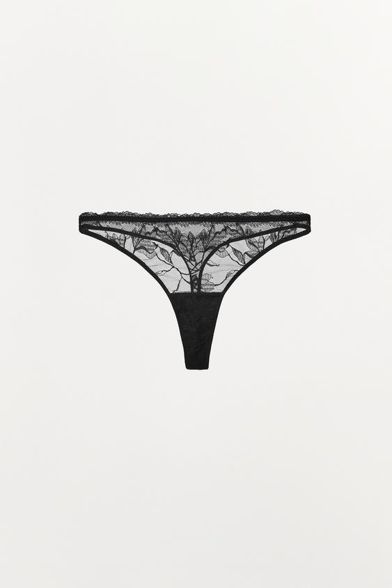 ZARA ТРУСЫ ТАНГА С ЦВЕТОЧНОЙ ВЫШИВКОЙ, ЧЕРНЫЙ