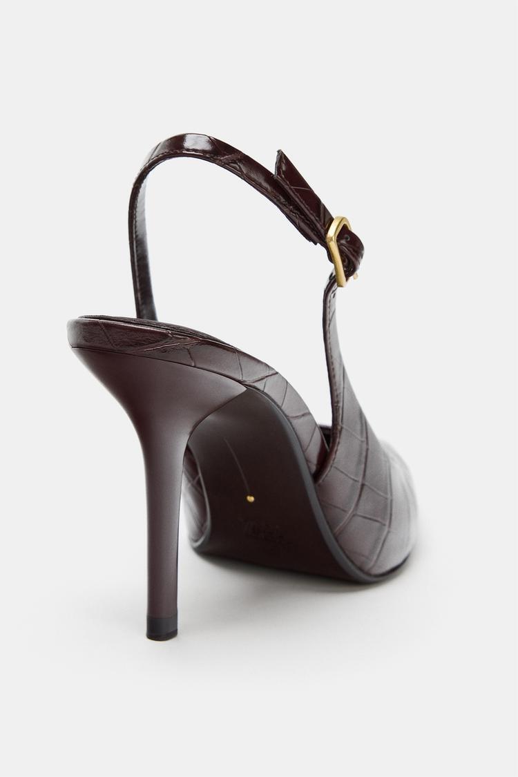 Туфли без задников с рельефным узором. Регулируемый ремешок с пряжкой сзади. Высокий тонкий каблук. Круглый вырез. Острый нос.