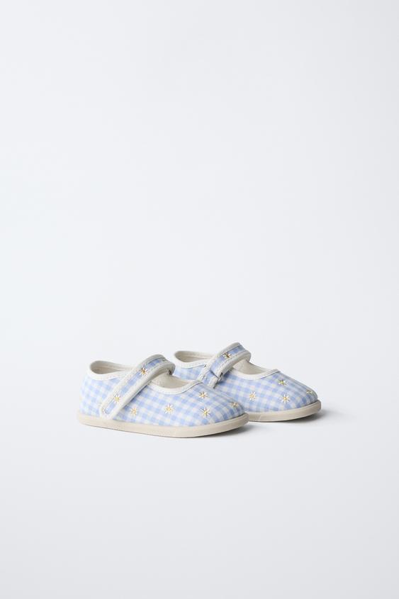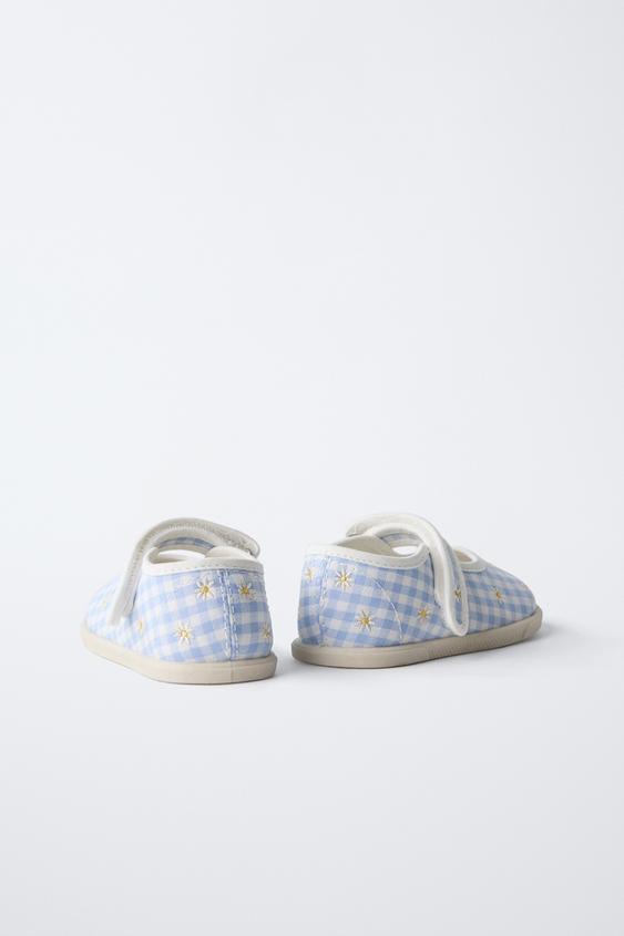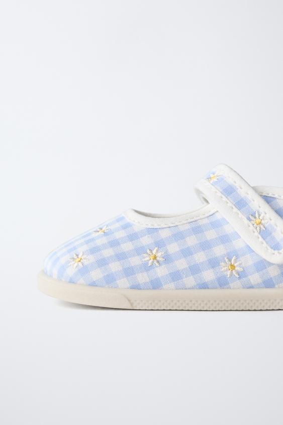 Очень гибкие туфли Мэри-Джейн с узором виши и цветочной вышивкой. Круглый, широкий и функциональный носок обеспечивает свободное движение пальцев ног. Ремешок с текстильной застежкой на подъеме. Гибкая стелька. Гибкая резиновая подошва с нулевым перепадом высоты между пяткой и носком и очень гибким задником.