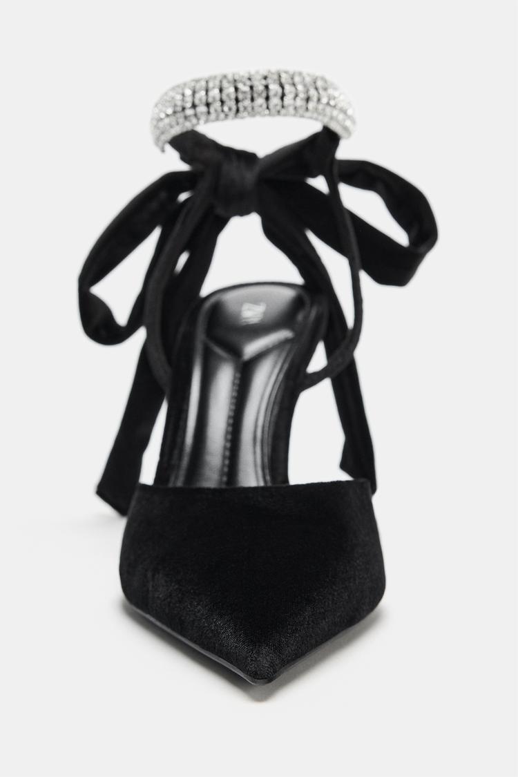 Туфли без задников с бархатным эффектом. Ремешок на щиколотке со стразами, регулируемый шнуровкой. Тонкий высокий каблук. Круглый вырез. Острый носок.