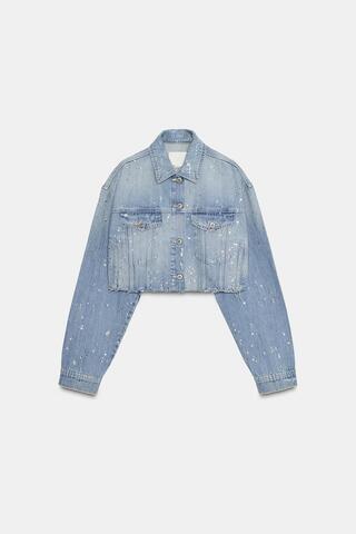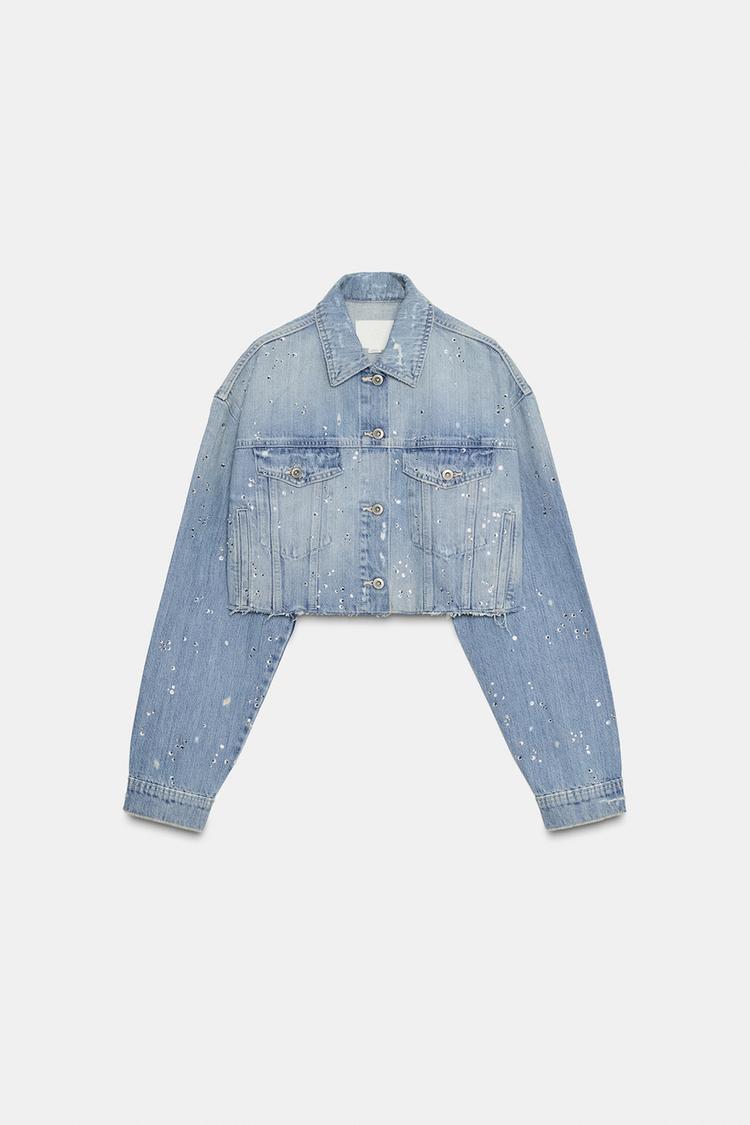 ZARA УКОРОЧЕННАЯ ДЖИНСОВАЯ КУРТКА TRF СО СТРАЗАМИ, СИНИЙ