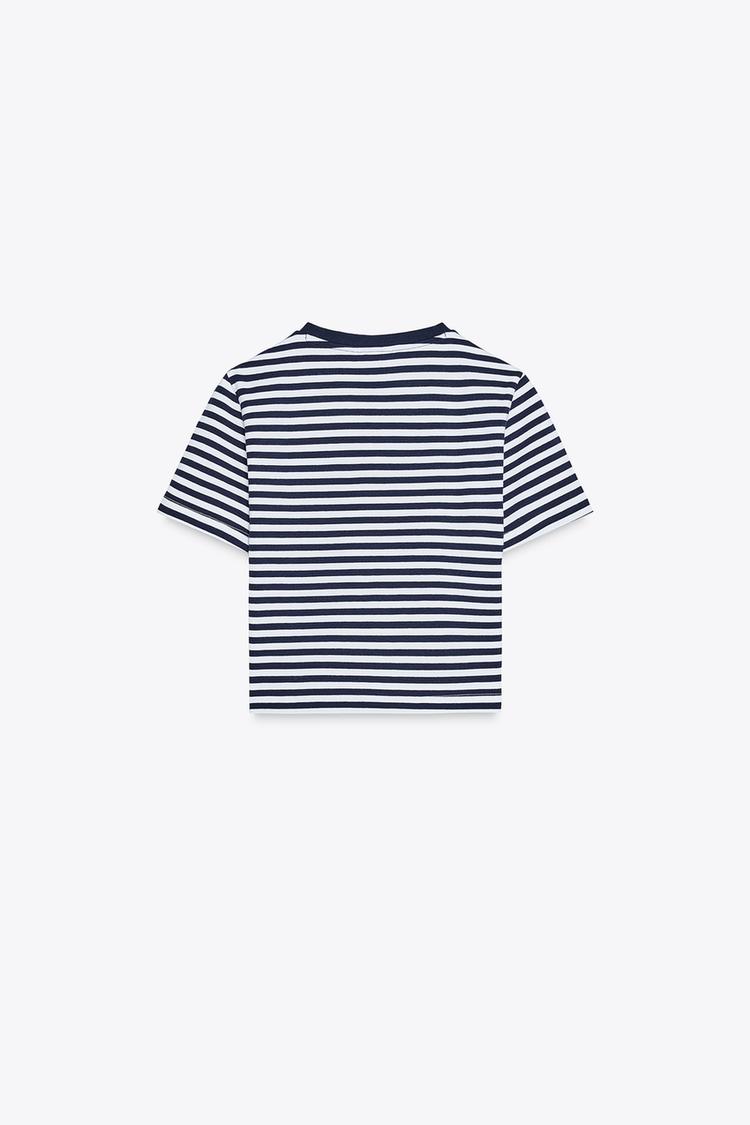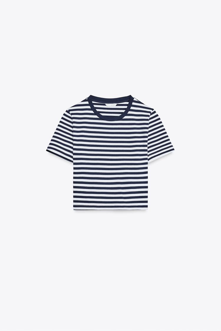 ZARA УКОРОЧЕННАЯ ФУТБОЛКА ИЗ ЭЛАСТИЧНОЙ ТКАНИ, СИНИЙ/БЕЛЫЙ