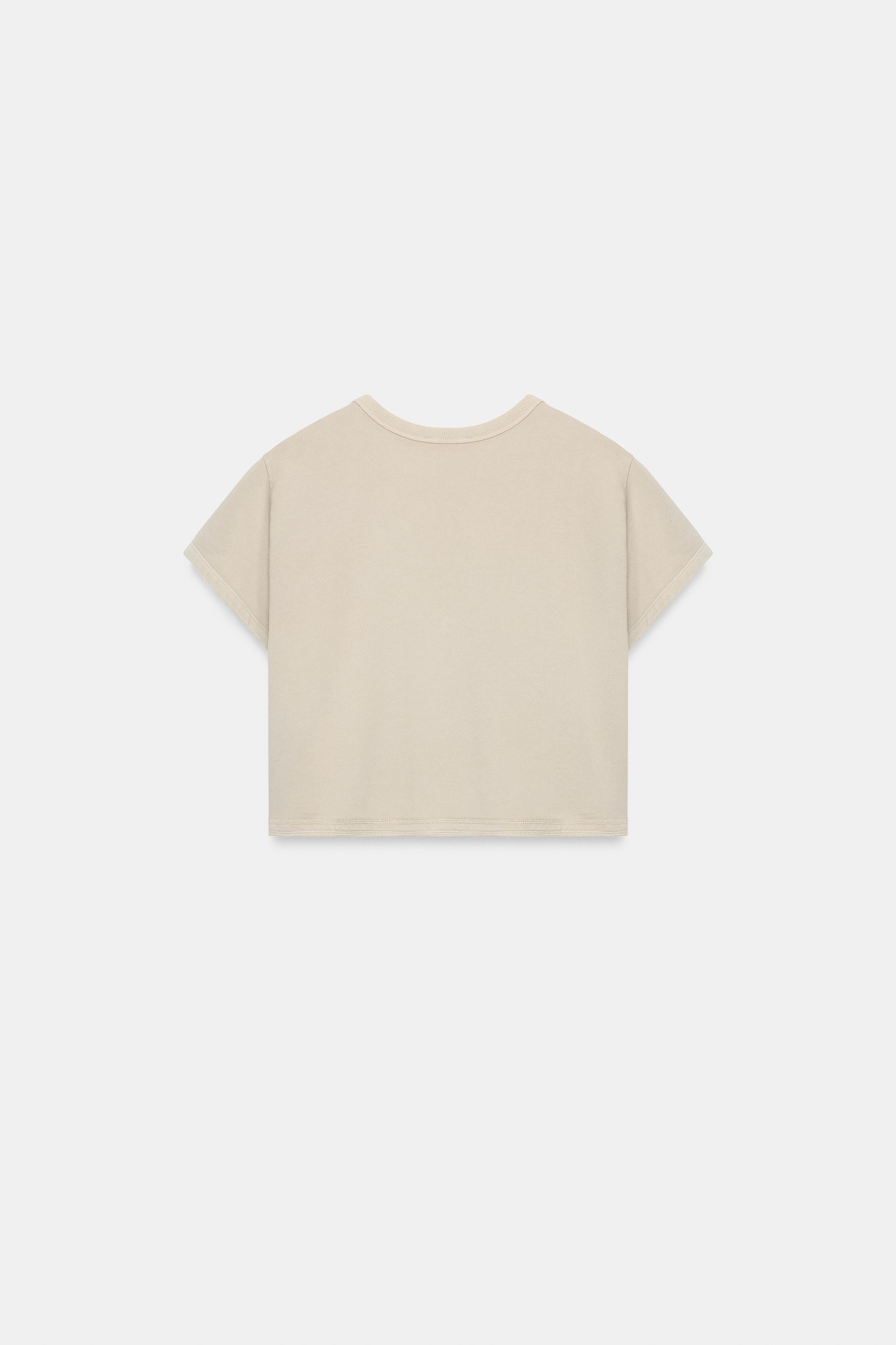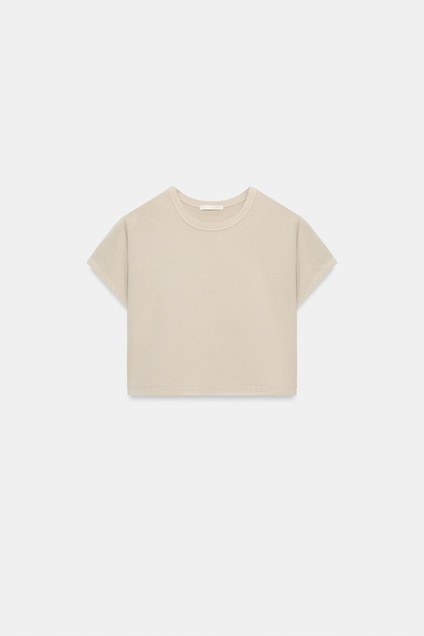 ZARA УКОРОЧЕННАЯ ФУТБОЛКА С ЭФФЕКТОМ ПОТЕРТОСТИ, КАМЕННО-С