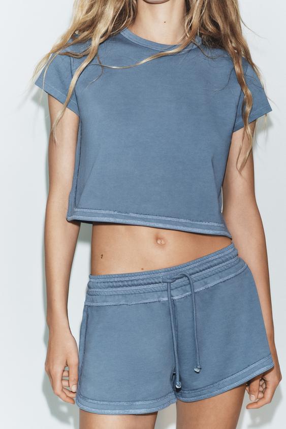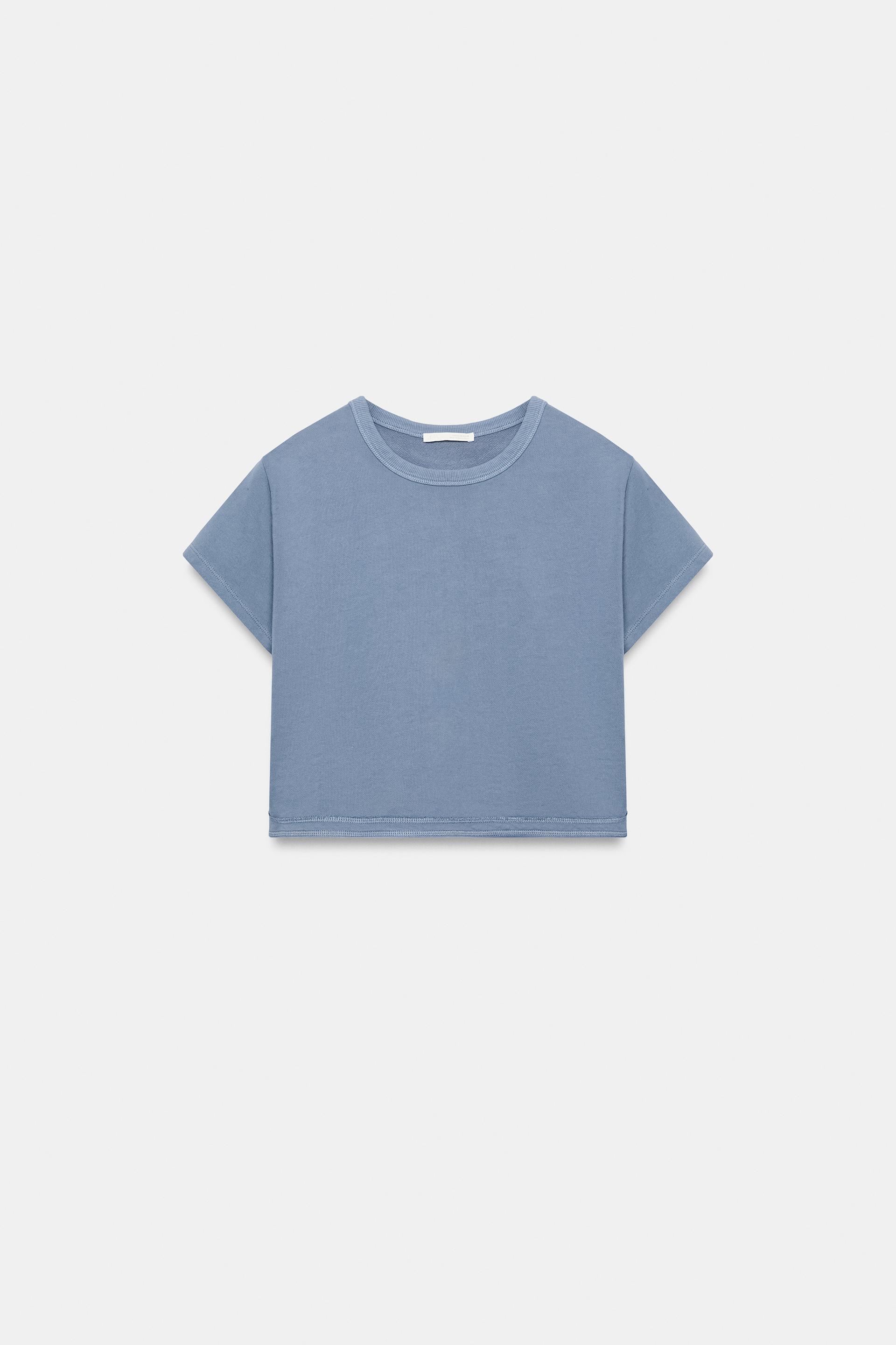ZARA УКОРОЧЕННАЯ ФУТБОЛКА С ЭФФЕКТОМ ПОТЕРТОСТИ, ЯРКО-СИНИЙ
